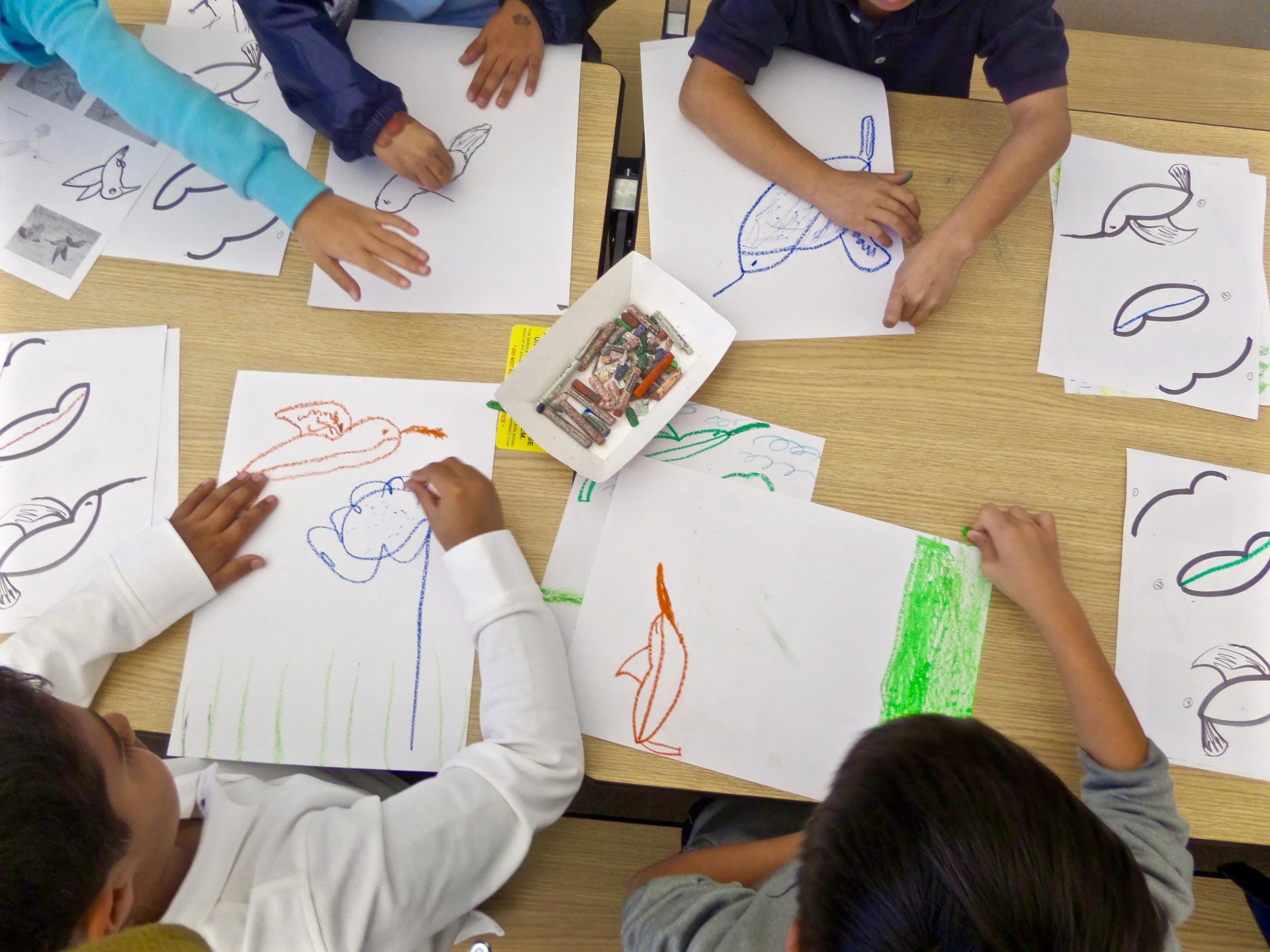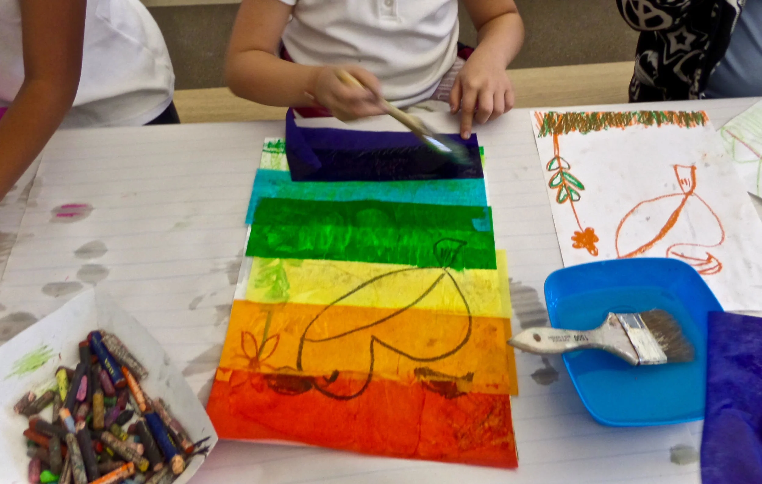 Upon request, Illustrator, Laura Peisner demonstrates an art lesson using an easy and beautiful watercolor resist technique. The results are spectacular and everyone has a good time.